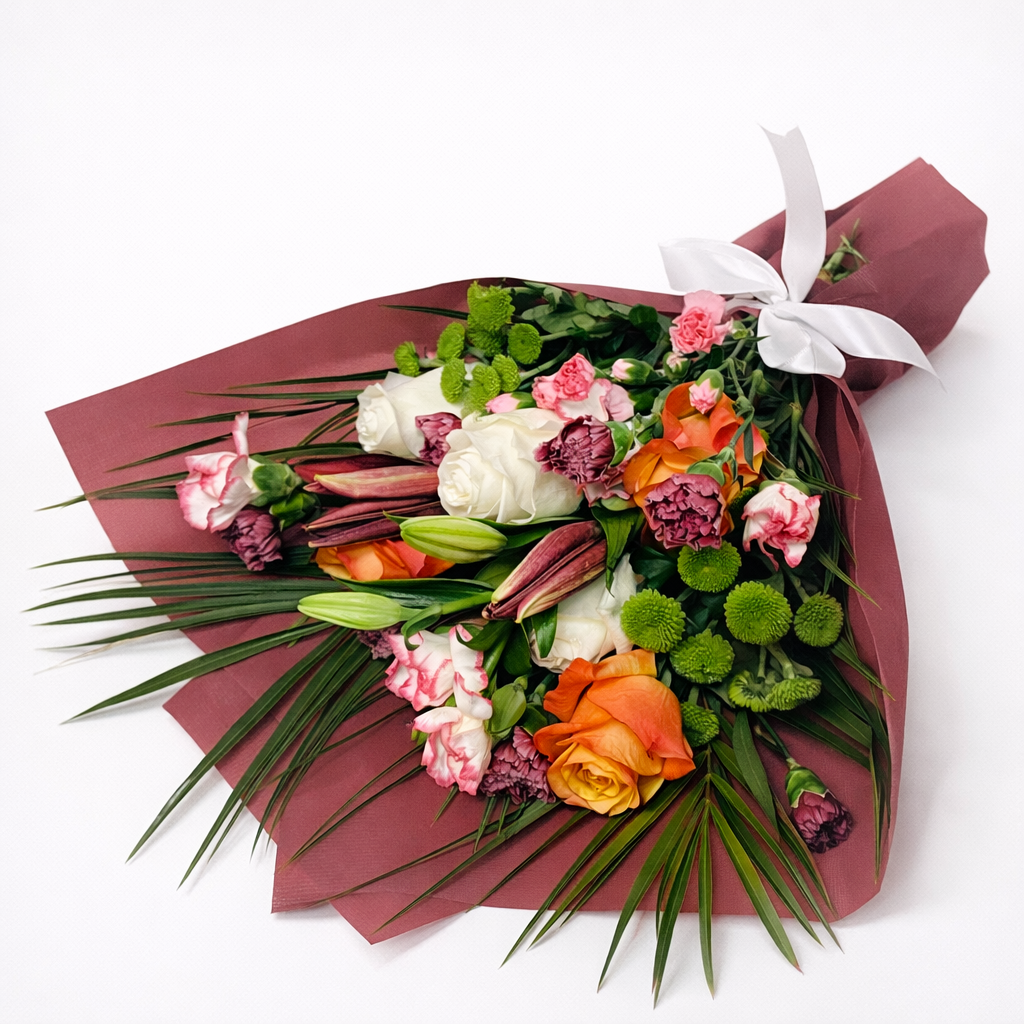 Një buqetë dinamike dhe elegante që kombinon ngrohtësinë e portokallisë me finesën e të bardhës dhe rozës. “Aurora Fiorista” është krijuar për të sjellë energji pozitive, elegancë moderne dhe një ndjesi luksi të lehtë. Kompozimi i saj i shtrirë me gjelbërim linear krijon një siluetë bashkëkohore dhe shumë të veçantë.