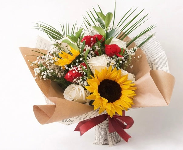 Një buqetë plot energji dhe pozitivitet, ku luledielli simbolizon lumturinë dhe optimizmin, ndërsa kombinimi me trëndafila dhe lule dekorative krijon një pamje moderne dhe të ngrohtë. Perfekte për ditëlindje, urime suksesi apo surpriza që sjellin buzëqeshje.