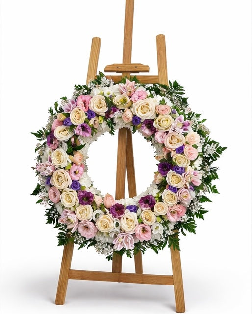 Dizajni i saj ceremonial dhe kombinimi i ngjyrave pastel krijojnë një prezencë solemne dhe shumë elegante, duke e bërë këtë kurorë zgjedhje ideale për ceremoni mortore, homazhe dhe përkujtimore.
